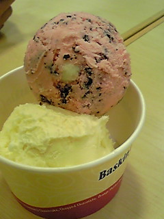 ストロベリーベースにチョコチップが入ってますが、そのチョコチップ(三種類)がイチゴの形でさらに中にストロベリーソースが入っているのです!おいしかったですが、原形を留めたチョコチップは一つだけでした11:24 PM on 4月 11th, 2009
