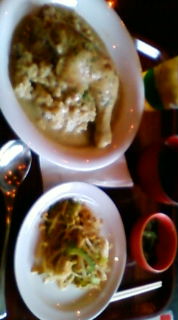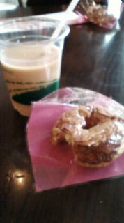 沖縄での最後の食事は…DFSギャラリアのfoodcolosseumにて骨付き鶏もも肉グリーンカレー定食(ゴーヤチャンプルーと海ぶどう付)と塩アーモンドキャラメル味のドーナツ型シュークリーム
